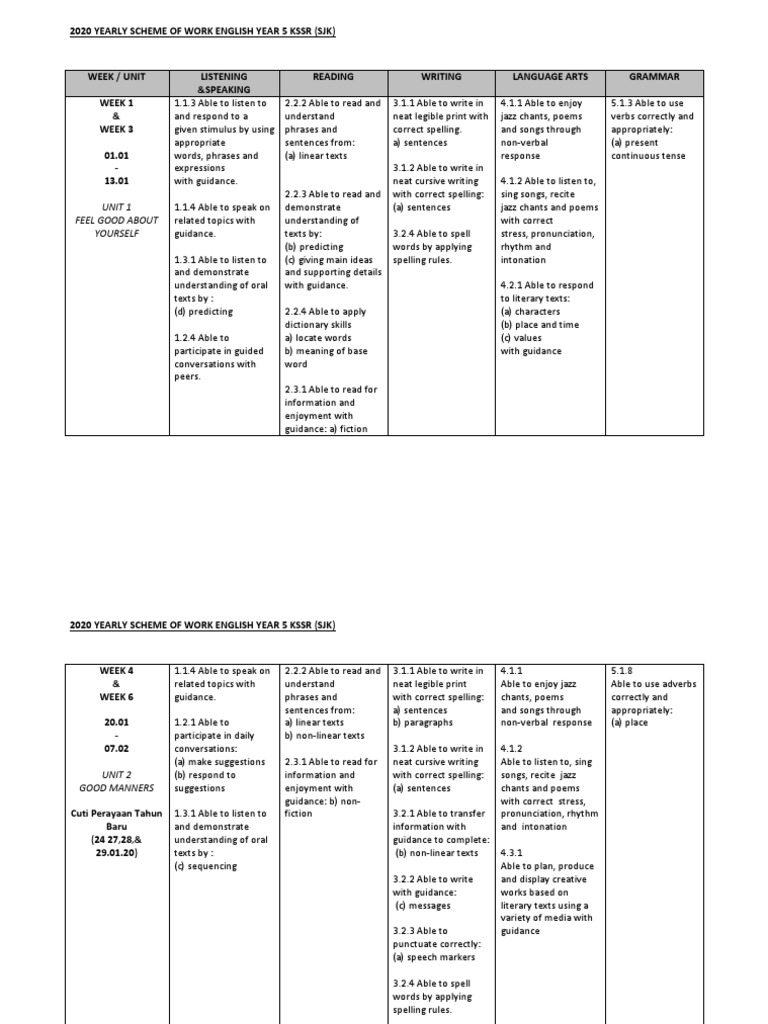 English Yearly Scheme Of Work Year 5 2020 Done English Language Writing