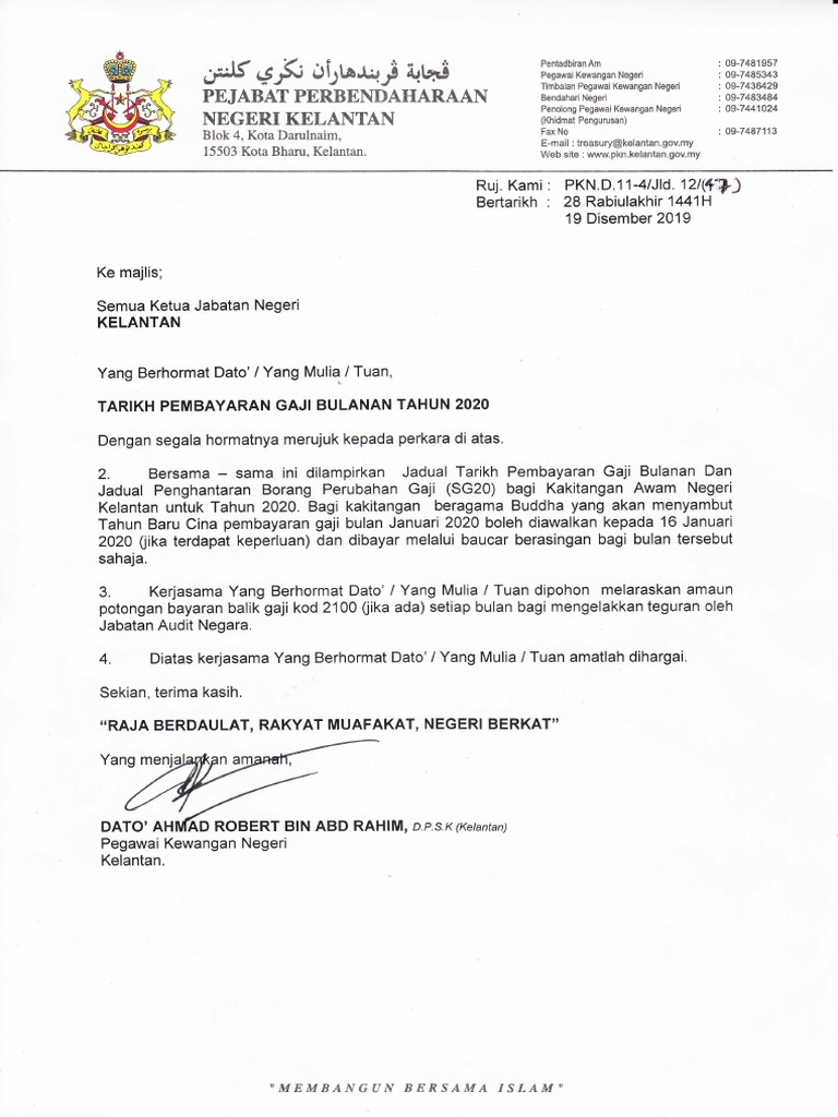 Jadual pembayaran gaji bulanan bagi tahun 2020 satu tarikh gaji untuk semua negeri bulan.