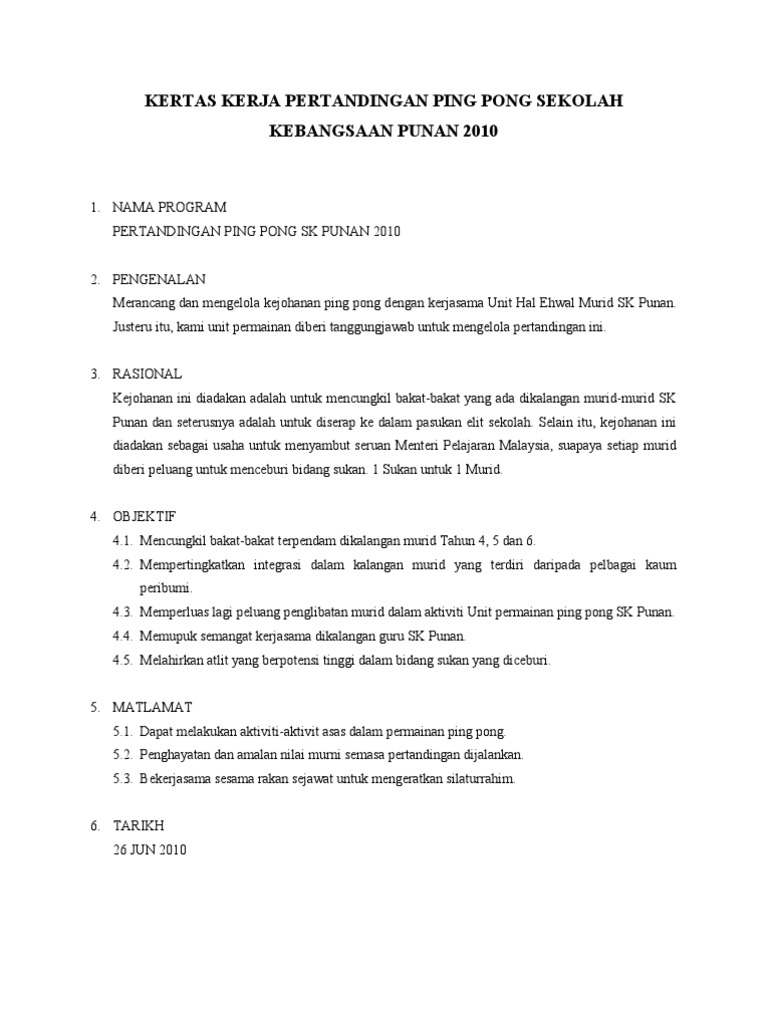 Kertas Kerja Pertandingan Ping Pong Sekolah Kebangsaan Punan 2010
