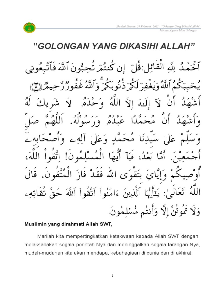 Persefahaman asas pembangunan ummah jabatan agama islam selangor 2 sidang jumaat yang dirahmati allah saya menyeru agar kita bersama sama meningkatkan ketakwaan kita kepada allah swt dengan melaksanakan segala perintahnya dan meninggalkan segala larangannya.