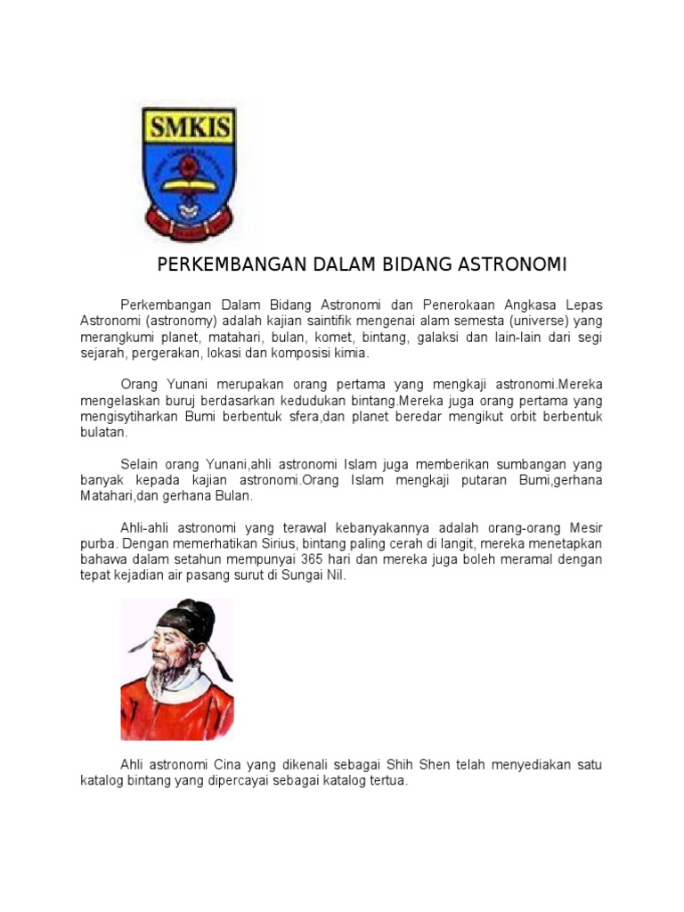 Perkembangan Dalam Bidang Astronomi Dan Penerokaan Angkasa Lepas