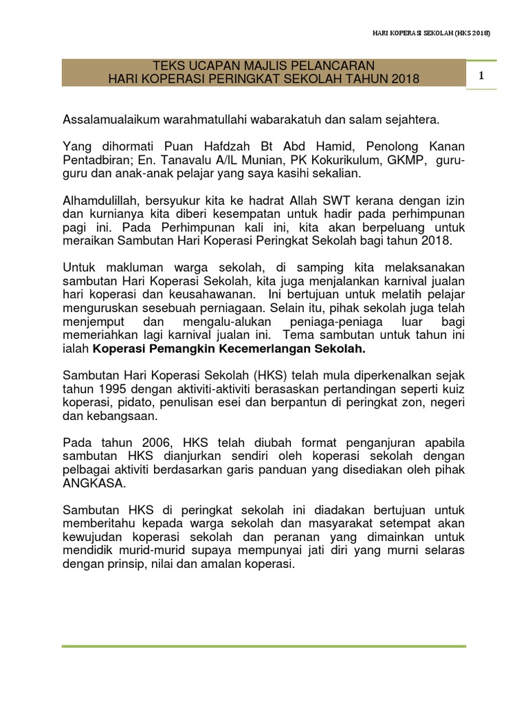Teks Ucapan Majlis Pelancaran Hks 2018