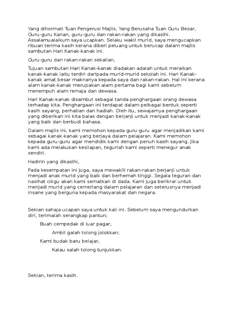Teks Ucapan Wakil Murid Hari Kanak Kanak